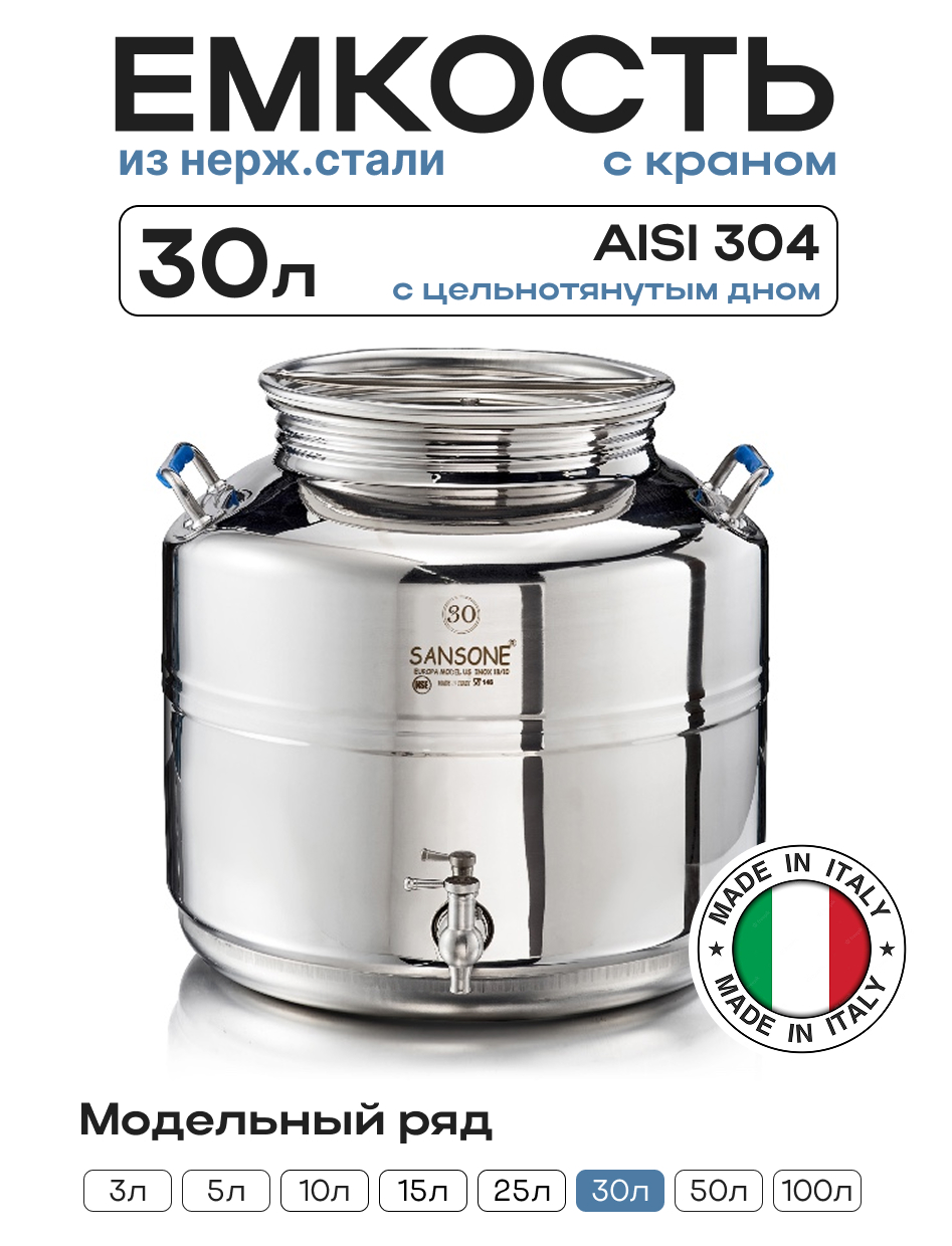 Пищевая бочка из нержавейки, ЕВРО 30 л, с краном, цельнотянутым дном