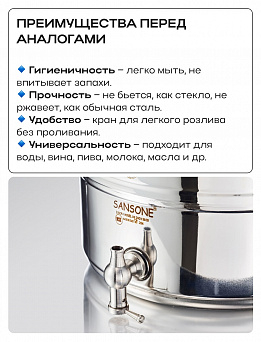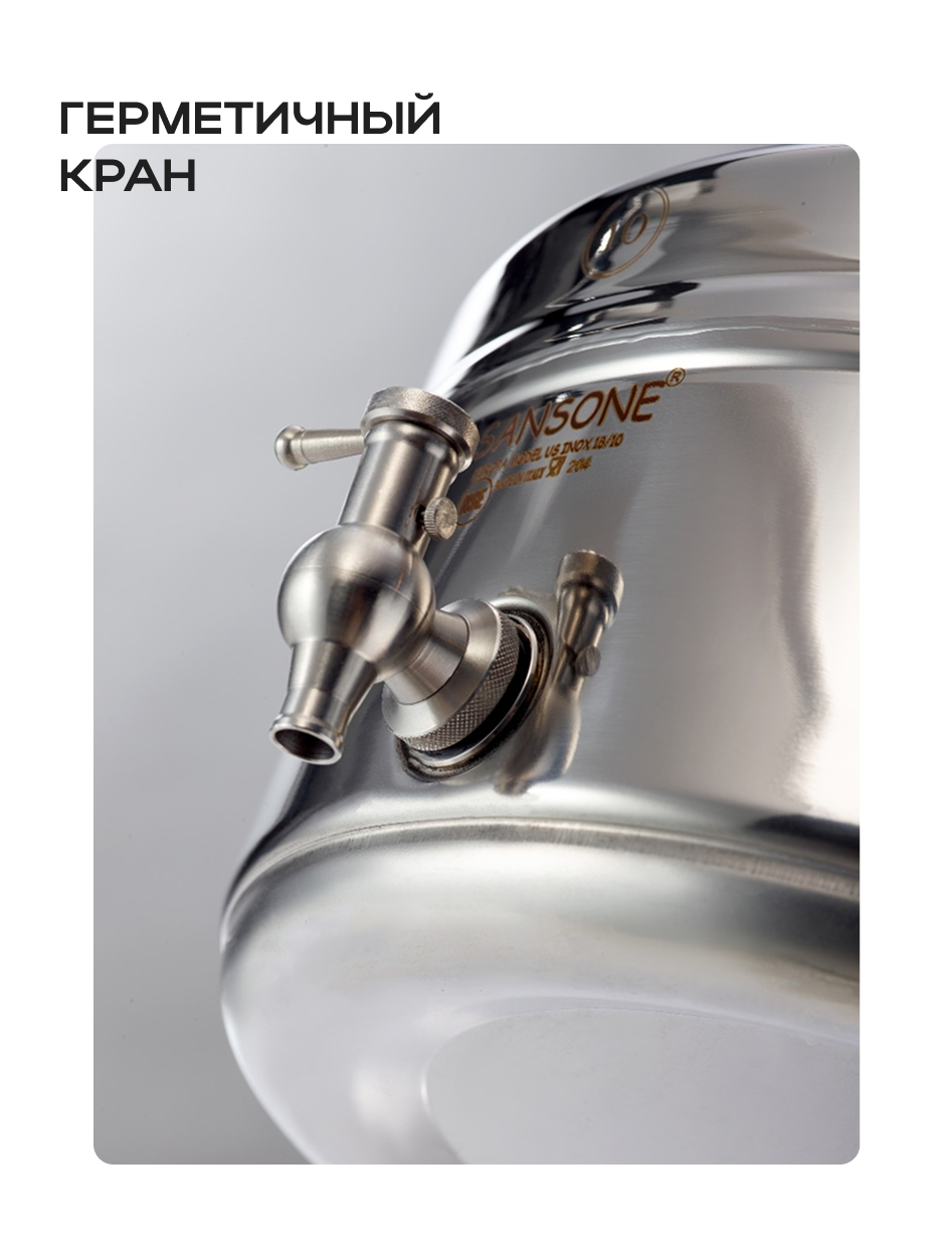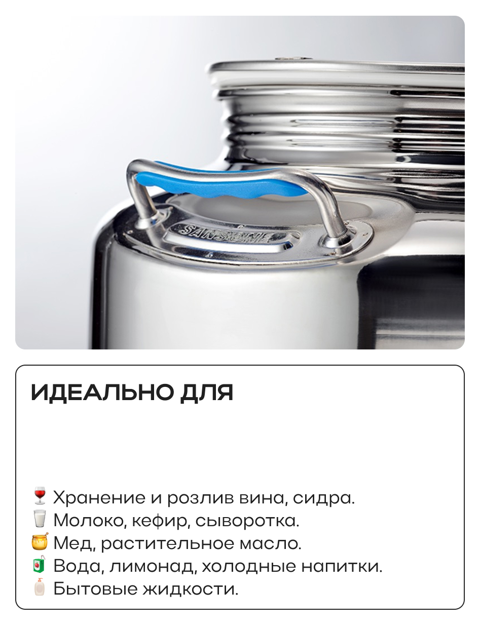 Бочки из высококачественной пищевой нержавеющей стали AISI 304 с герметично закручивающейся крышкой (силиконовый уплотнитель) и краном в нижней части бидона.