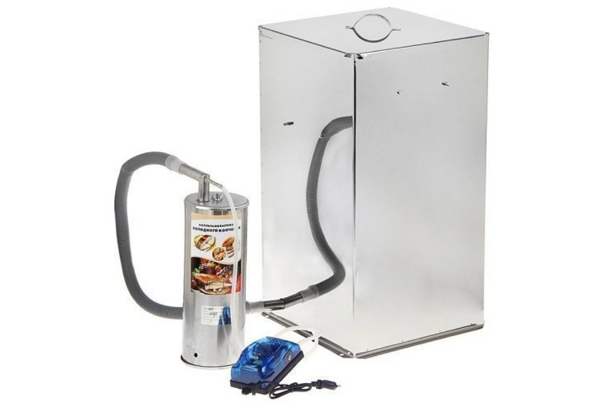 Домашняя коптильня холодного копчения "Дым Дымыч" 02Б из пищевой нержавеющей стали. Жаропрочная, устойчивая к коррозии. Все необходимое в комплекте, в том числе дымогенератор для деревянной щепы, а также электрический компрессор. Коптильня не занимает много места дома и позволит вам готовить домашние деликатесы самостоятельно без особых усилий и затрат.