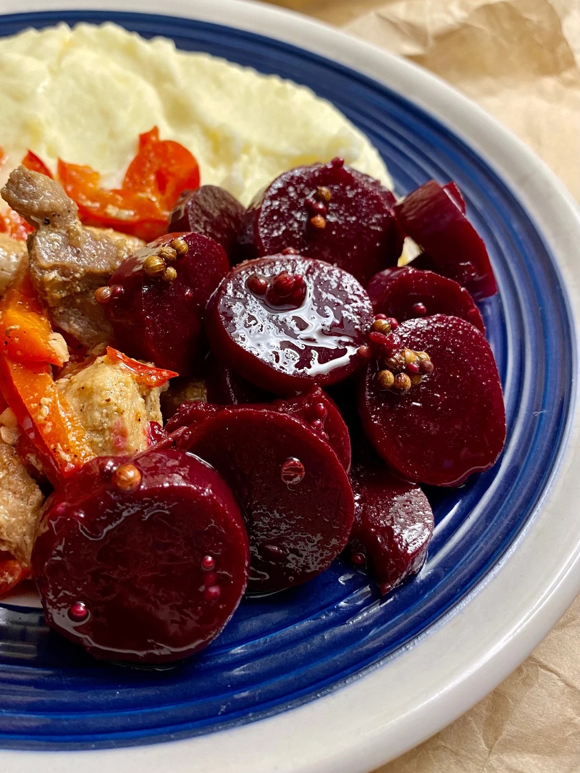 • Свеклу запекаем в фольге в духовке при 190* примерно час. Остужаем, чистим. Нарезаем ломтиками, можно и брусочками.